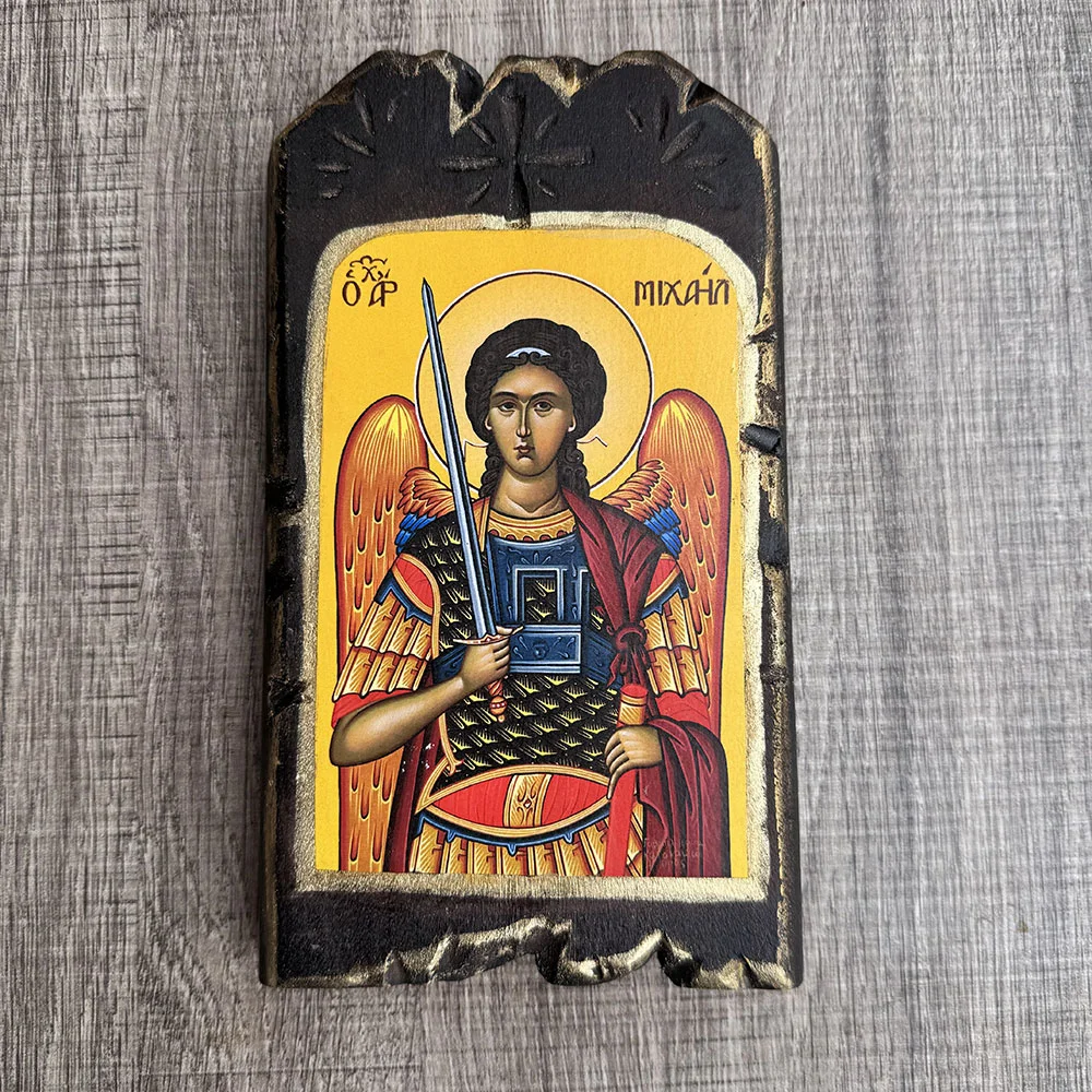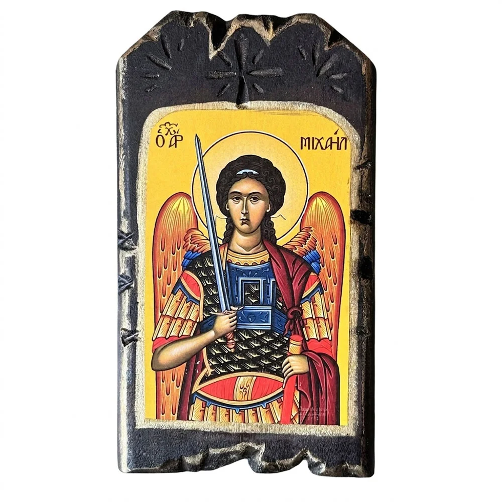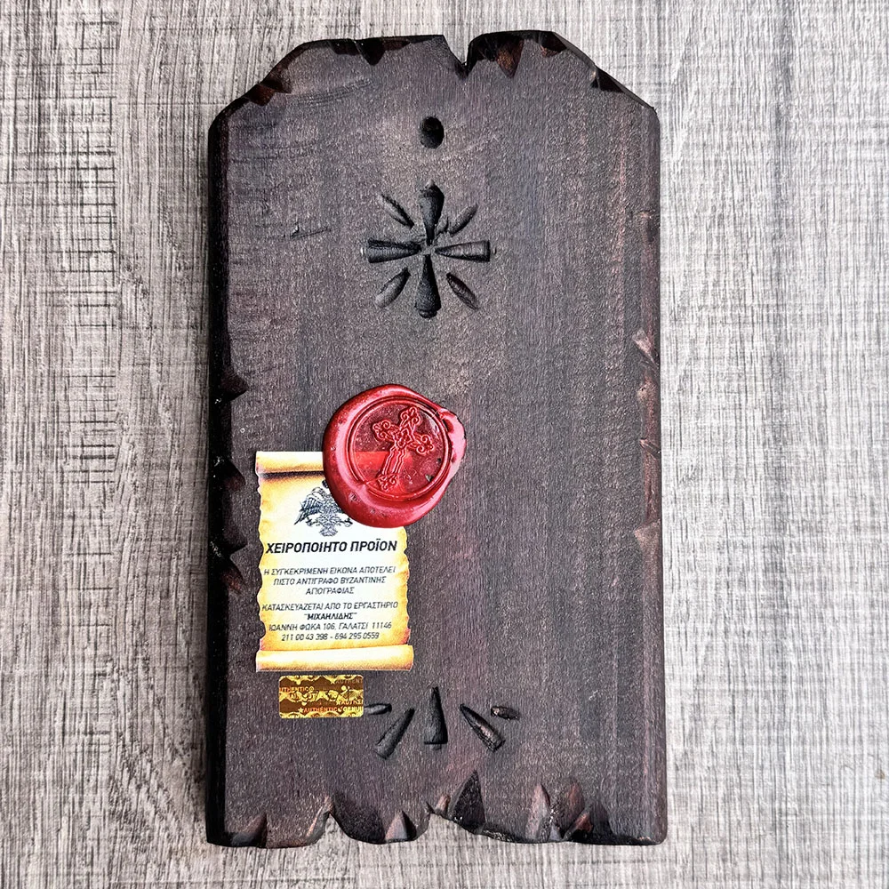 Η εικόνα είναι κατασκευασμένη σε ξύλινη βάση με τεχνητή παλαίωση, που της προσδίδει μοναδικό χαρακτήρα και αίσθηση παλαιότητας, σαν να πρόκειται για διαχρονικό ιερό κειμήλιο. Τα σκαλιστά τελειώματα και οι φθορές στο περίγραμμα ενισχύουν την αυθεντικότητα και τη μοναδικότητα κάθε τεμαχίου.