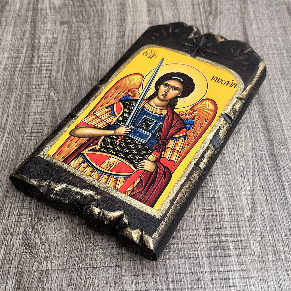 Η χειροποίητη βυζαντινή εικόνα του Αρχαγγέλου Μιχαήλ αποτελεί ένα αυθεντικό εκκλησιαστικό αντικείμενο, εμπνευσμένο από τη βυζαντινή αγιογραφική παράδοση. Ο Αρχάγγελος απεικονίζεται με αυστηρό και γαλήνιο βλέμμα, κρατώντας σπαθί ως σύμβολο προστασίας και δικαιοσύνης, ενώ τα ζεστά χρυσά και κόκκινα χρώματα αναδεικνύουν τη θεϊκή του υπόσταση.